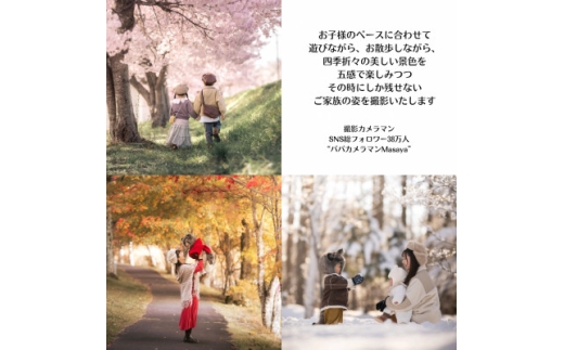 長野県茅野市を拠点に活躍する人気のパパカメラマンMASAYAによるロケーション撮影割引チケットです。SNSで注目を集める写真は、自然の美しさと家族の魅力を引き出す丁寧な撮影が特徴です。