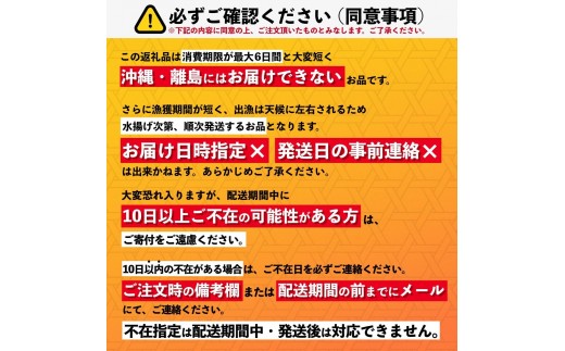 ・不漁や悪天候などにより、やむを得ずお届けができない際は、「同額帯の別返礼品での代替対応」となる場合があります。ご了承ください。