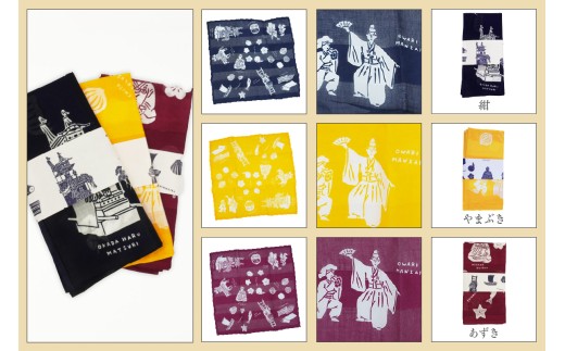 知多市の特産品である知多木綿に、知多市の伝統文化やお祭り、知多木綿、ペコロスなどの特産品のイラストをあしらった、ハンカチです。