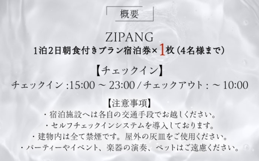 ZIPANG 1泊2日朝食付きプラン 宿泊券×1枚 (4名様まで) |