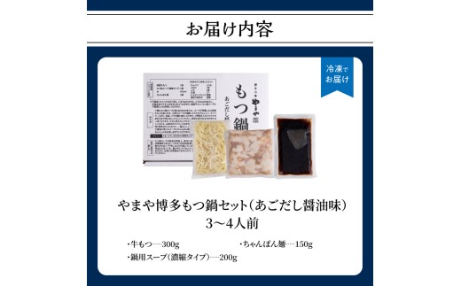 やまや 博多もつ鍋セット あごだし醤油味(3~4人前) もつ鍋 国産 牛もつ モツ 博多 やまや スープ付き 麺付き 冷凍 福岡県 八女市