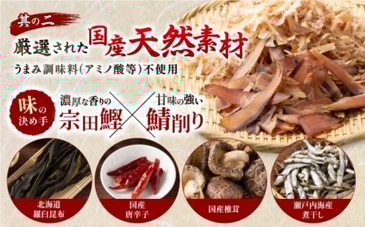 化学調味料無添加の味だしは、吟味厳選した国産原料に限定、海洋深層水(天海の水)から、土佐鰹・さばをベースにしただしをとり、杉樽仕込み『熟成本醸造丸大豆醤油』(福岡産ふくゆたか使用)・熟成醸造相生本みりん・粗糖(種子島産)・椎茸(国産)・唐辛子(国産)など、贅をつくした素材で味付けした商品です。