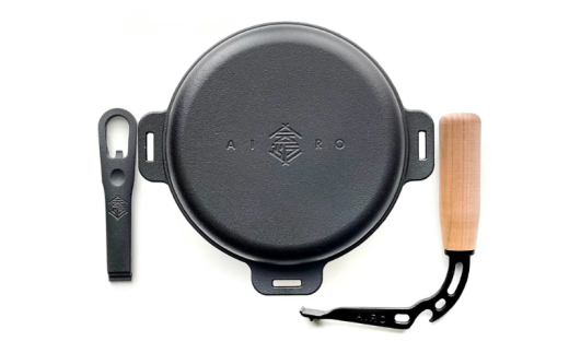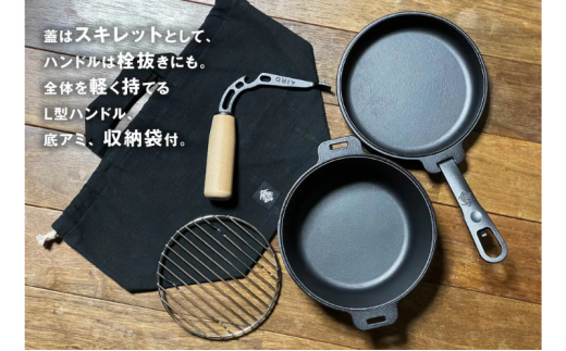 蓋はスキレットとして、ハンドルは栓抜きにも。全体を軽く持てるL 字ハンドル、底アミ、収納袋付のフルセットです。