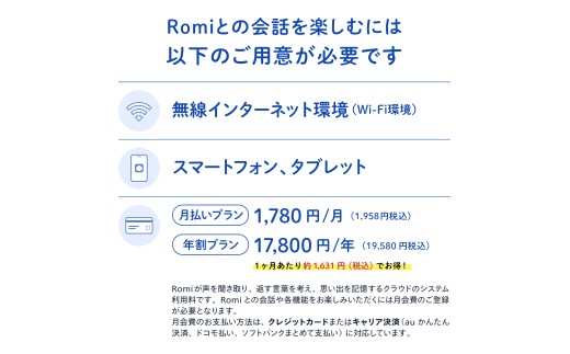 ※Romiのご使用には、以下の3点が必要です。(月会費は初回24か月間は不要)