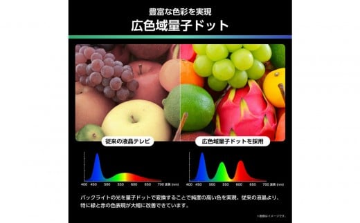 ●【広色域量子ドット】バックライトの光を量子ドットで変換することで純度の高い色を実現。従来の液晶より、特に緑と赤の色表現が大幅に改善。