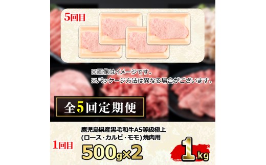 1回目:【鹿児島県産黒毛和牛A5等級極上(ロース・カルビ・モモ)焼肉用:約500g以上×2 (約1kg)】