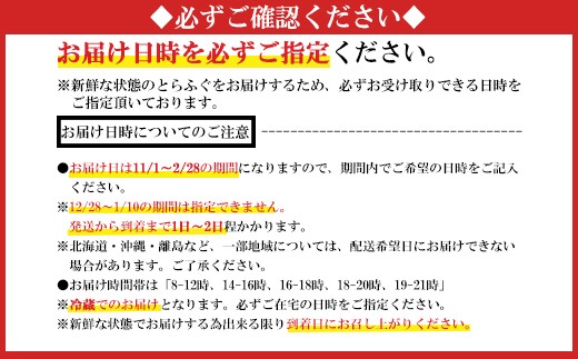 ●お届け日は11/1〜2/28の期間になりますので、期間内でご希望の日時をご記入ください。 ※12/28〜1/10の期間は指定できません。 ※発送から到着まで1日〜2日程かかります。 ※北海道・沖縄・離島など、一部地域については、配送希望日にお届けできない場合があります。ご了承ください。 ●お届け時間帯は「8-12時、14-16時、16-18時、18-20時、19-21時」 ※冷蔵でのお届けとなります。必ずご在宅の日時をご指定ください。 |