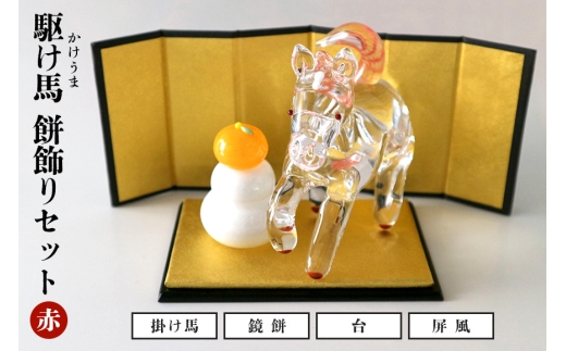 【赤】駆け馬(かけうま)・餅飾りセット 令和8年 R8 2026年 干支 馬 午 鏡餅 屏風 お正月 モチーフ 茨城県 ガラス 置物 赤 青 ガラス工房 神魂 笠間市 茨城県