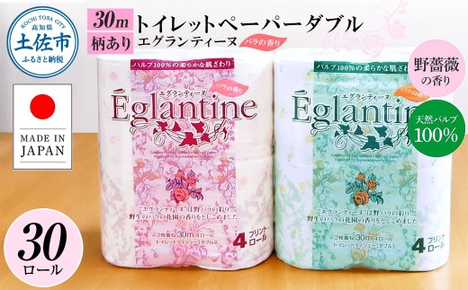 トイレットペーパー ダブル 天然パルプ100% エグランティーヌ 30ロール入り 30m 野薔薇の香り 香り付き 野バラ プリント入り 柄入り ピンク イエロー 日用品 消耗品