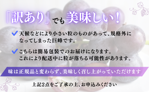・天候などにより小さい粒のものがあって、規格外になってしまった巨峰です。味は正規品と変わらず、美味しく召し上がっていただけます。