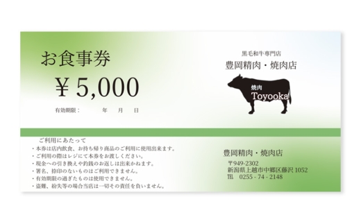 【黒毛和牛 専門店】豊岡精肉・焼肉店 『5,000円分 お食事券』 新潟県 上越市 商品券 利用券 招待券 優待券 チケット お食事券 ギフト デート 観光 ビジネス 出張 牛肉 焼き肉 やきにく 送料無料