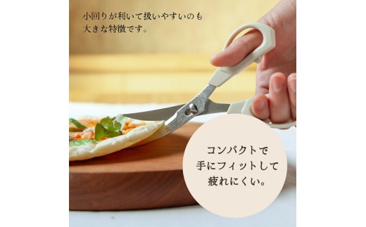 全体のサイズはコンパクトでありながら、実は刃渡りは一般的なキッチンバサミと同等。出番が少ない機能を削ぎ落し、本当に良く使う「ハサミ」に特化しました。わずか50gと軽く、コンパクトだから手にフィットして疲れにくく、小回りが利いて扱いやすいのも大きな特徴です。特徴的なカーブ刃でスッと食材に入り込み、更には先はギザ刃だから食材を逃がしません。タコや鶏肉などの滑りやすく柔らかい食材から、カニや昆布などの堅い食材までスムーズにカットできます。