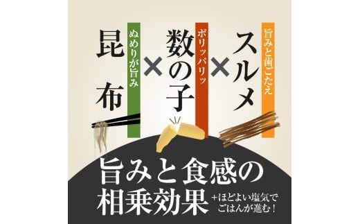 昆布のぬめりとスルメの旨味に、ポリッパリッ食感の数の子を混ぜ合わせました。