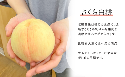 収穫直後は硬めの食感で、追熟するときめ細やかな果肉と濃厚な甘みが感じられる。比較的大玉で食べ応え満点の桃。