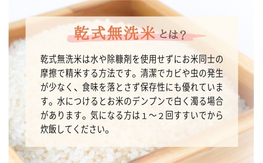 ※乾式無洗米です。乾式無洗米は水や媒体を一切使わずに精米されたお米の表面を乾式研米処理しています。表面に汚れや糠がないため雑菌が少なく、酸化しにくく、保存性・食味もよいお米です。1~2回すすいでから炊飯してください。