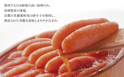 数種類の唐辛子をブレンドした秘伝の調味液に、すけとうだらの卵をじっくりと漬け込み、じっくりと熟成。