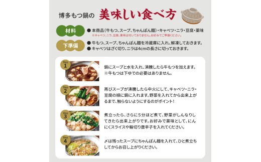キャベツやニラ、豆腐などを入れて煮込むだけで、本場博多のもつ鍋が手軽にご家庭でお楽しみいただけます。