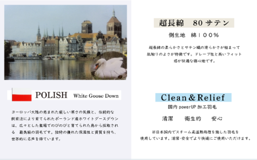 サイズ:150×210cm 重量:1.3kg 側生地:綿100%(超長綿80サテン) 中身:ポーランド産ロイヤルホワイトグース93%(ダウンパワー400dp以上) 2層式キルト仕立て 日本製 |