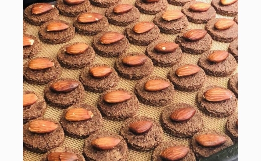 ココア風味のアーモンドバタークッキーにアーモンドをまるごと1個トッピングしました。