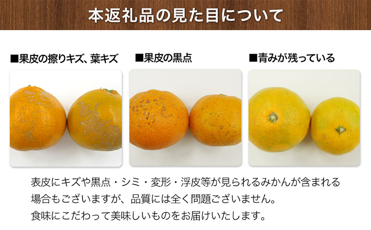 返礼品注記 | 日の当たらない風通しの良いところに保存してください。 中には酸味が強く感じられるものもございます。柑橘の酸味にはそれぞれ好みがございますが、もし酸味が気になる方は、少し日を置いてからお召し上がりください。 【返礼品のお申込みにつきまして】 下記の内容を必ずご了承の上でお申込みください。 ■フルーツ・野菜等の返礼品につきましては、天災・天候等諸事情の影響により返礼品の品質に問題が発生した場合や、収穫量が激減した場合などに、発送順延・発送不可となる場合がございます。発送不可となった場合は別の返礼品を代品としてお送りする等の対応をさせていただきます。予めご了承ください。 ■長期不在等寄附者様のご都合でお受け取りが出来なかった場合、再送はいたしかねます。お受け取りが不可能な期間がある場合は、お申込み時の備考欄にご入力いただき、必ずお知らせくださいますようお願いいたします。 ■お申込み・決済完了の際には申込確認メールを、ご予約のお品/期間限定品につきましては発送時期案内メールを、発送の際には発送案内メールをお送りしております。 ※寄附者様のメール設定によっては、迷惑メールと判断されてしまい、案内メールが届かない場合がございます。予めご了承いただきますよう、よろしくお願いいたします。 |