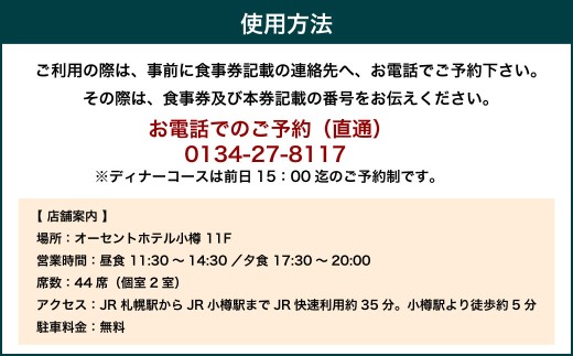 ご利用の際は、事前に食事券記載の連絡先へ、お電話でご予約下さい。その際は、食事券及び本券記載の番号をお伝えください。