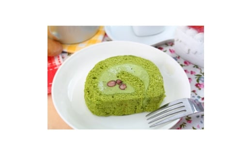 新緑がまぶしい季節のお茶畑のような豊かな緑色のスポンジに、もったりとした抹茶ムースをたっぷり塗って、北海道産大納言小豆をたっぷりまぶして巻き上げています。