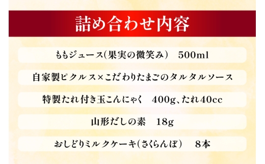- 特産品 詰め合わせ 美味玉手箱 まほろば セット [高畠町観光協会 山形県 高畠町 tk06ays670006] もも ジュース ピクルス たまご 卵 タルタルソース 特製 たれ こんにゃく 玉こんにゃく だし だしの素 ミルク ケーキ お菓子 おかし