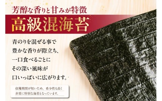 お口に入れた瞬間に甘みと、青のりの豊かな香りを味わえる最高級の焼混海苔です。高級混海苔は生産量が限られた貴重品として人気です。厳選した混海苔を、摘みたての味わいをそのままに自社工場で焼き上げました。当店自慢の焼き海苔です。