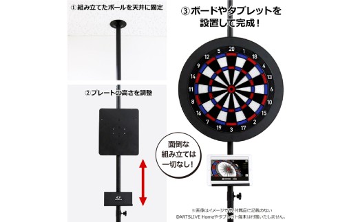 スマートフォン、タブレットと連動して楽しめるホームボード「ダーツライブホーム」。簡単にダーツライブホームをセットすることができる「ポールスタンド」がセットになった返礼品となります。