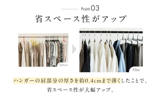 ジャストフィットハンガーは、肩部分の厚さを約0.4cmまで薄くしたことで、省スペース性が大幅アップ。