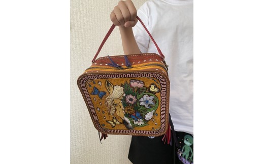 【説明】手の込んだデザインのハンドメイドBagです。大きさも今の流行しているコンパクトタイプより少し大きいサイズで使いやすいと思います。実は2拠点生活をされている俳優さんをイメージして、カービングで描いた馬と花を散らばせた可愛い作品です。牛革使用と言うと重量感があるイメージだと思いますが、軽くできました。