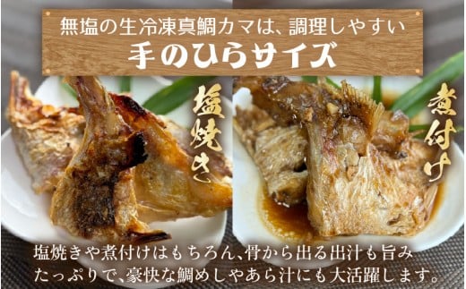 1匹1kg前後の国産真鯛からとれる希少な「カマ」部分を、丁寧に下処理し、新鮮なまま真空パック&急速冷凍でお届けします。