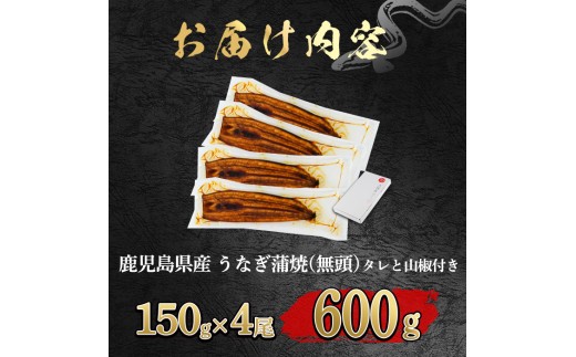 【0244339a-2602】<2月上旬発送予定>東串良町のうなぎ蒲焼(無頭)(4尾・計約600g・タレ、山椒付) うなぎ 高級 ウナギ 鰻 国産 蒲焼 蒲焼き たれ 鹿児島 ふるさと 人気 【アクアおおすみ】