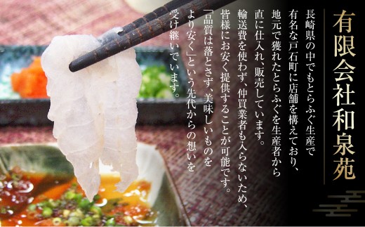 和泉苑は長崎県の中でもとらふぐ生産で有名な戸石町に店舗を構えており、地元で獲れたとらふぐを生産者から直に仕入れ、販売しています。