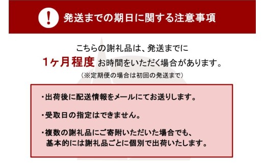 寄附完了後、1ヶ月程度お時間を頂く場合がございます。 出荷後はメールにて通知いたしますのでメールが届くまでお待ちください。 出荷時期に長期不在等がある場合は備考欄にご入力ください。 × 配送日、出荷時期の指定不可 【他謝礼品を含む複数の品をお選びの場合でも、品毎に出荷いたします。】 |