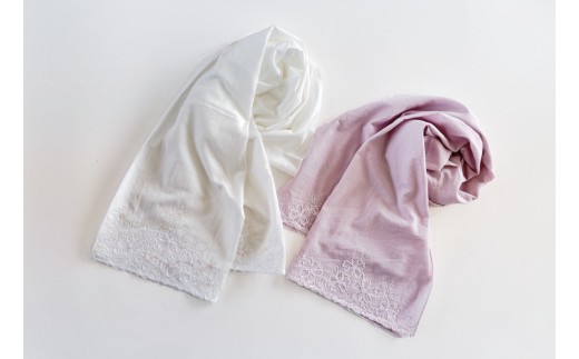 オーガニックコットンを使用した綿麻スラブ生地に、古くから日本人に愛されてきた桜を刺繍したストールです。春の象徴、花の代名詞とも言える桜をモチーフに、2種類のコード刺繍とステッチ刺繍を施しました。細いテープで開花した桜を、細いコードでほころぶ桜花を、そこに漂う花香をステッチで表現しています。また両端の刺繍デザインが異なるのもポイントです。