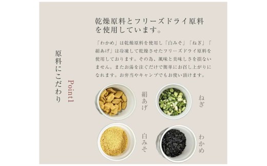 わかめ、あげ、ねぎが入っており、食べたいときにお湯を入れるだけで簡単に本格的なお味噌汁がいただけます。