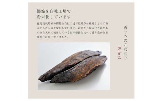 鹿児島枕崎産の鰹節を自社工場で粉末化し、最初から粉末化されたものを使用した味噌汁と比べて香り豊かなみそ汁に仕上がりました。