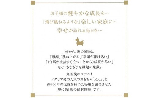 イタリアの人気玩具「RODY(ロディ)」と伝統工芸「九谷焼」がコラボレーションした置物です。九谷焼は360年の伝統と華やかな色絵装飾が特徴ですが、もっと九谷焼を知ってもらいたい思いから誕生した逸品です。「RODY」のモチーフである「馬」は「飛躍」「跳ね上がる」など縁起のいい意味があり、お孫さんへのプレゼントや出産祝いに贈る女性が増え、現代版「馬の縁起置物」として喜ばれています。絵付けは伝統作家や女流作家などが手がけ、バリエーションも豊富です。ギフトやコレクションでお使いください。