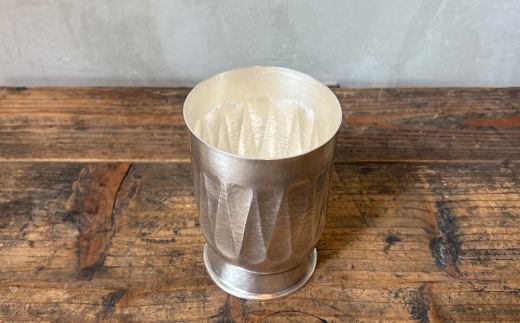 銀の板を鍛金の技術で打出し、均して作られたものです。胴、高台を接合してビアカップの形になります。胴体部分には金鎚を使い、縦線の文様を打ち出している。完全に手作りのビアカップは珍しいと言える。飲用としてはもちろんですが、本棚に飾るのもおすすめです。