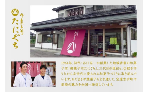 初代である私の祖父(谷口忠一)が和菓子屋になりたく、中能登の和菓子屋であるみうらさんで池袋の和菓子屋で修行しており1964年に創業しました。