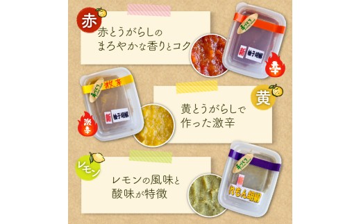 みどり工房 柚子胡椒 レモン胡椒 4種類 セット 各60g 緑 マイルド 赤 辛口 黄 激辛 とうがらし 上毛町産 レモン 柚子 胡椒 調味料 薬味 香り コク 酸味 料理 冷凍 お取り寄せ 福岡県 上毛町 送料無料