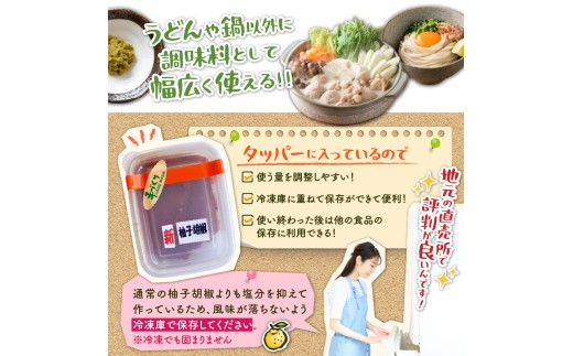 通常の柚子胡椒よりも塩分を抑えて作っているため、風味が落ちないよう冷凍庫で保存してください。(冷凍でも固まりません)