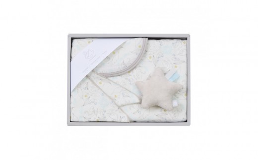 ガーゼおくるみ、ガーゼハンカチとラトルが入ったBOX入りギフトセット。